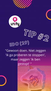 Eigenlijk had ik de moed wel opgegeven, want ik woonde in een groot studentenhuis met 28 huisgenoten waarvan meer dan de helft rookte. Dus er werd ook overal gerookt. Daarnaast werkte ik in de horeca en daar stond roken gelijk aan pauze. En met toen nog stage was ik veel op de fiets naar cliënten toe, en was elk fietsmoment een rookmoment. Dit was dus erg lastig. Uiteindelijk werd er op mijn stage een training aangeboden van ‘ik stop ermee’ en hier konden we met cliënten en collega’s naar toe. Ik ging eigenlijk vooral mee voor om samen met een aantal cliënten te gaan, maar ben gaandeweg gemotiveerd om te stoppen met roken. Wat mij hier echt heel goed bij geholpen heeft is dat ik met alle rokende collega’s ging stoppen, en er dus een enorme sociale druk hing op het stoppen. Elke maandag was het weer koppen bij elkaar en even overleggen hoe het weekend was gegaan. En als er iemand had gerookt dan werd daar ook de hele week over gepraat haha. Johnno